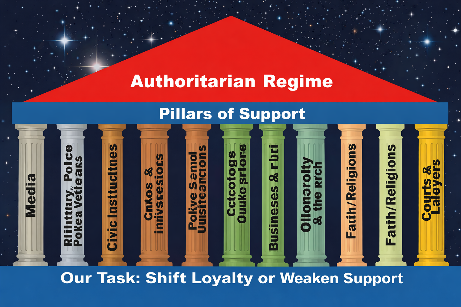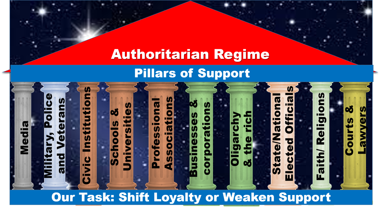 Other authors and texts we recommend: - Timothy Snider “On Tyranny” and “The Road to Unfreedom”, - Erica Chenowith “Civil Resistance - What Everybody needs to know”; - From the CNC, The International Center on Nonviolent Conflict PILLARS OF SUPPORT