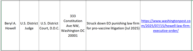 In 2025, Judge Beryl Howell publicly accused the DOJ of seeking to undermine her by attacking her character and requesting her removal from a case connected to an executive order targeting a law firm.